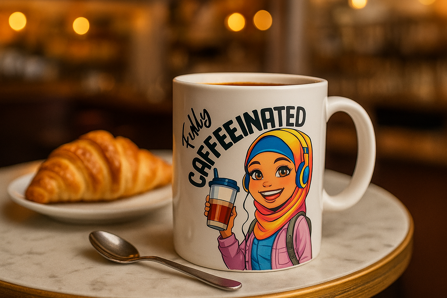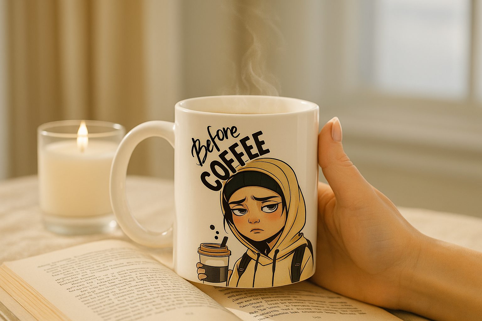 This playful two-sided mug design perfectly captures the morning mood, from “Before Coffee” to “Fully Caffeinated.” Featuring a vibrant hijabi illustration with expressive detail, it’s a blend of humor, style, and caffeine-powered truth.