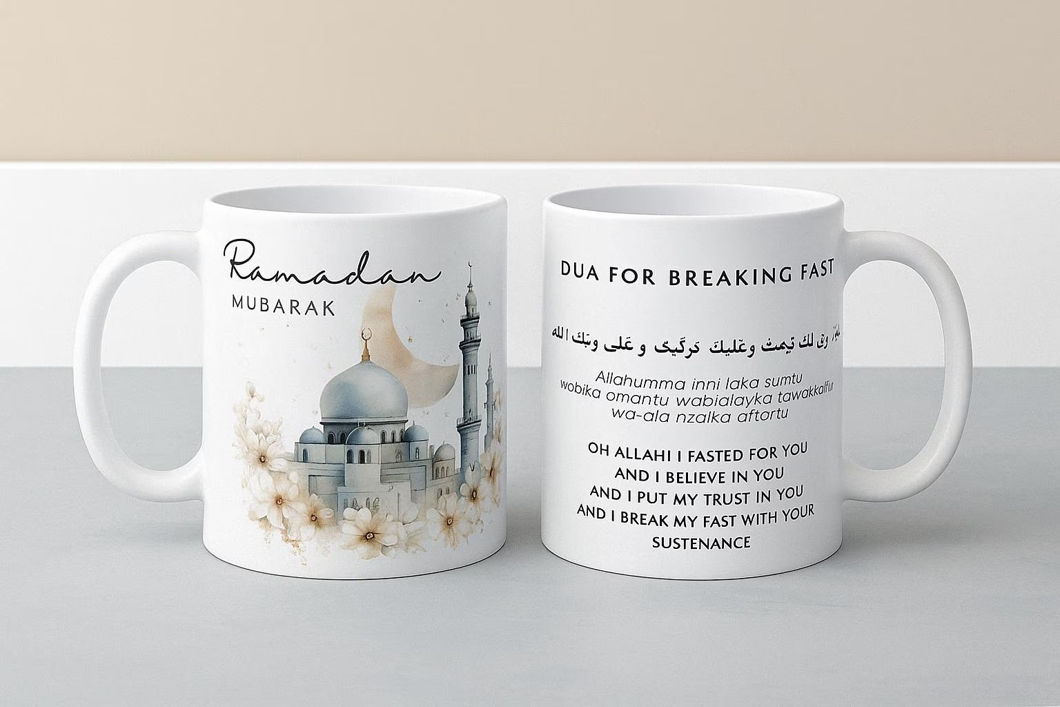 A meaningful way to honor the spirit of Ramadan with every sip. This beautifully designed Ramadan Mubarak mug features a serene watercolor masjid surrounded by soft floral accents, paired with the Dua for Breaking Fast in both Arabic and English.
