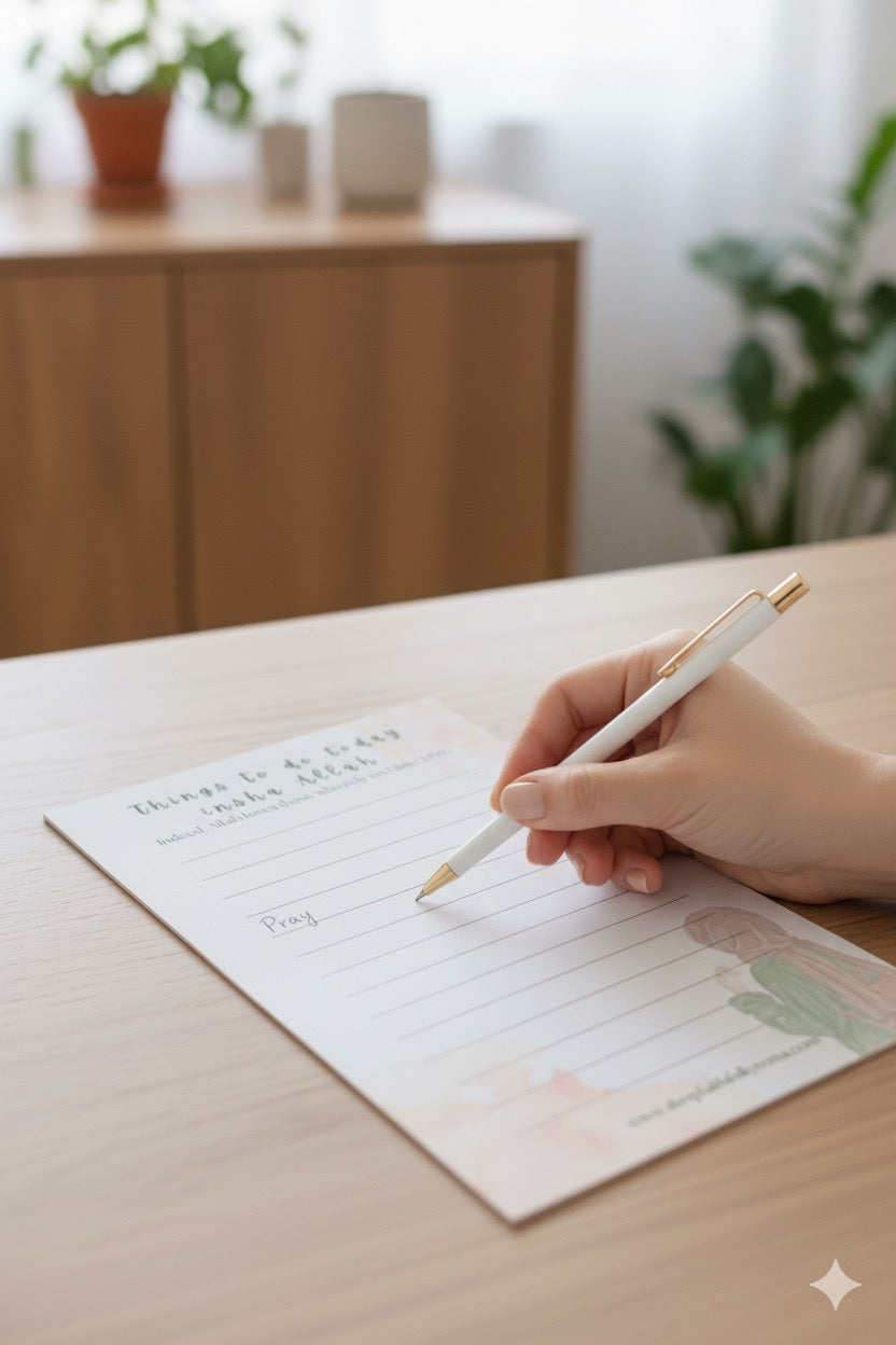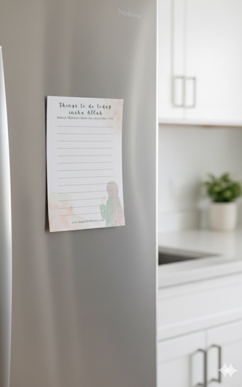 Plan your day with faith and intention using our Things To Do Today Insha Allah notepad. Designed with a soft watercolor background and a heartfelt reminder from the Qur’an: “Indeed, Allah loves those who rely on Him” (3:159) This notepad helps you stay organized. Perfect for your fridge, workspace, or as a thoughtful gift.